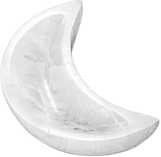 Prachtig afgewerkt seleniet schaaltje in de vorm van een maansikkel. Zeer geschikt om edelstenen en sieraden op te bewaren.